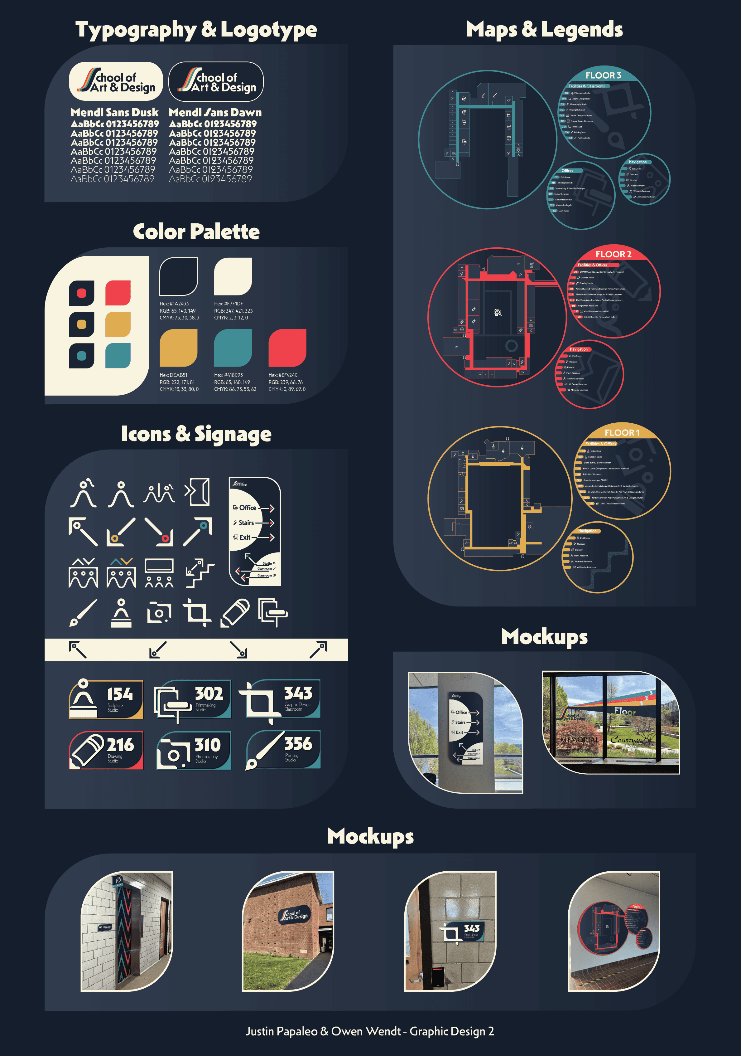 we created a logotype designed to reflect the values and ideas of Art and Design at Binghamton. The palette we chose is high contrast with accents of CMY inspired colors to bring out a feeling of creativity while also keeping it professional. The S is dynamic to show a sense of movement and evolution always present within the department. We took this palette and implemented it in the system in effective ways that help someone walking into the building to easily navigate. The first step in this process was making an icon system. We took a 20x20 grid and designed the icons around this system. We used proportionate stroke sizes to create a cohesive icon system that felt very original. We did this by using circles and using the S from the logotype as well as lines with one or two corners rounded. Next we had to make maps for the building, and we needed a way to differentiate floors. Our solution was to color code the floors with colors from our logotype. This helps the viewer navigate more efficiently, and gives each floor its own identity. We then put our Icons in the maps where they corresponded to and gave it that off-white color we used to contrast with the navy blue of the background. We also color coded the arrows on the icons to match which floors they were pointing to. We filled in the hallway paths, but kept the rest as an outline to give the viewer a better understanding of where they can and should walk. The last step in the process was to create signage and super graphics. We used the rest of the system as a guide to create these and used the icons in our classroom signs to connect it back to the maps. Then we create signage pointing to where certain areas would be using color coded arrows once again. Lastly we mocked up what a super graphic might look like explaining the color coding of the floors, and we also mocked up all of our signage as well. All of this together creates a cohesive system that anybody walking into the building can understand and navigate very easily.